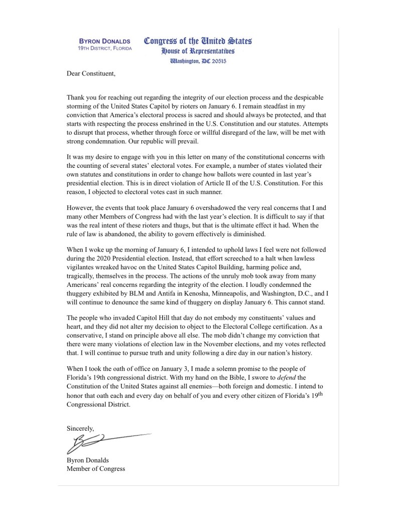 The response I received (by email, dated Jan. 17, 2021; see below for full text) was … well … wordy, to say the least. The response was addressed to “Dear Constituent” (apparently Mr. Donalds’ staff have not yet mastered the skills required to personalize canned responses), and – to his credit – it spelled out clearly his condemnation of the violent attacks on the US Congress that occurred on Jan. 6, 2021.
