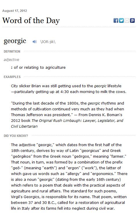 “Georgic,” today’s Merriam-Webster Word of the Day, is the root of my surname. Those who know me well would probably see humor in this, especially since I have never lived on a farm, have never been known for a particularly green thumb, and consider successfully growing jalapeño peppers and basil on the roof deck to be a major agricultural achievement.