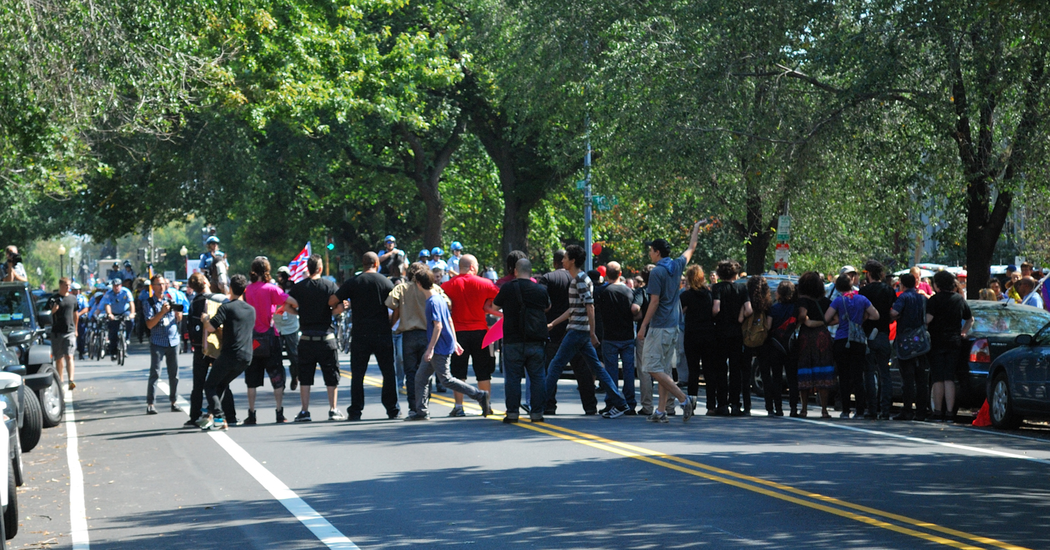 CounterProtesters1 Published September 23, 2012 at 1500 × 786 in Hatred Meets Anger: The Aryan Nation vs Protesters ← Previous Next → As the Aryan Nation marchers move from Lincoln Park down East Capitol street, counter-protesters block their way.