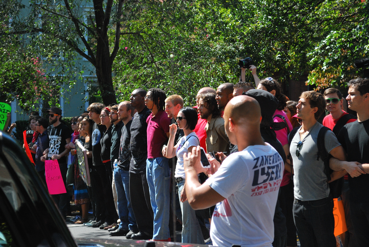 ProtestersLinedUp Published September 23, 2012 at 1500 × 1004 in Hatred Meets Anger: The Aryan Nation vs Protesters ← Previous Next → Protesters block the street, arm in arm.