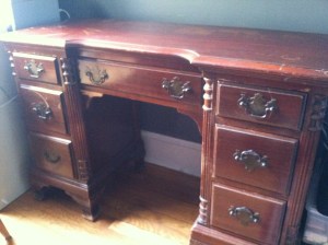 I live in a relatively small space. For mostly sentimental reasons, I’ve kept a few pieces of furniture that used to belong to my grandmother, Eileen “Nana” MacGeorge. Nana passed away January 21, 2005, just one week shy of her 99th birthday. Today I gave away one of those pieces of furniture, an old worn wooden desk that actually had been a vanity at its birth many decades ago.